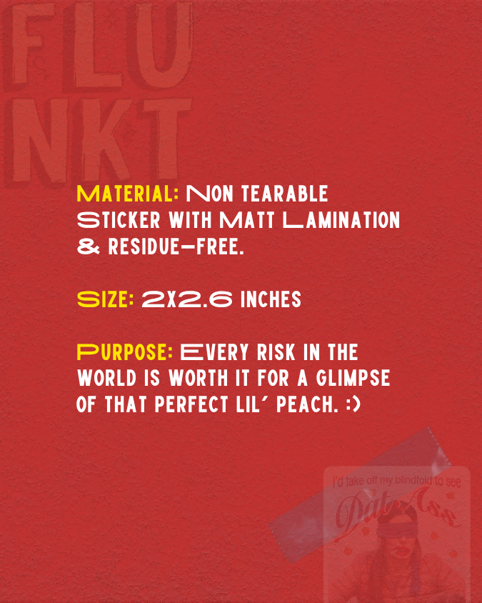 This sticker pays homage to cinematic devotion, confirming that some sacrifices are, indeed, worth the reward. It features a (slightly modified) scene from a famous blindfolded boat ride, declaring that every risk in the world is worth it for the sight of that perfect posterior. This piece is for those who are highly absurd in their appreciation of anatomy.