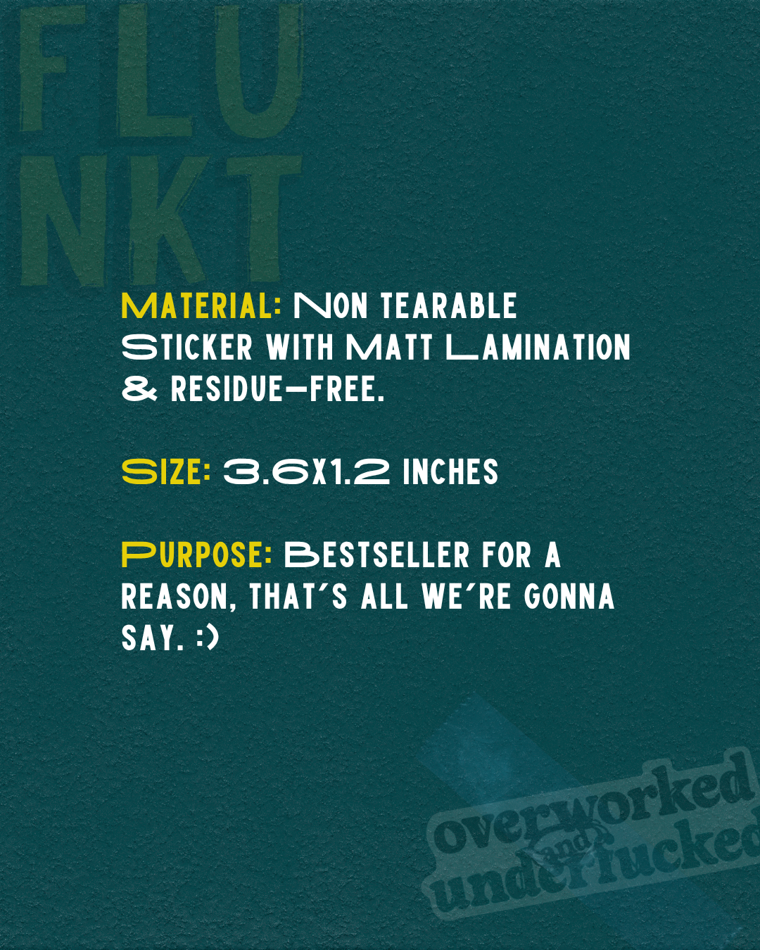 Material/FAQFlunkt ensures every product is crafted with love and attention to detail, making it perfect for collectors and enthusiasts alike. Our stickers are waterproof, durable vinyl—they’re built to survive your daily chaos.
