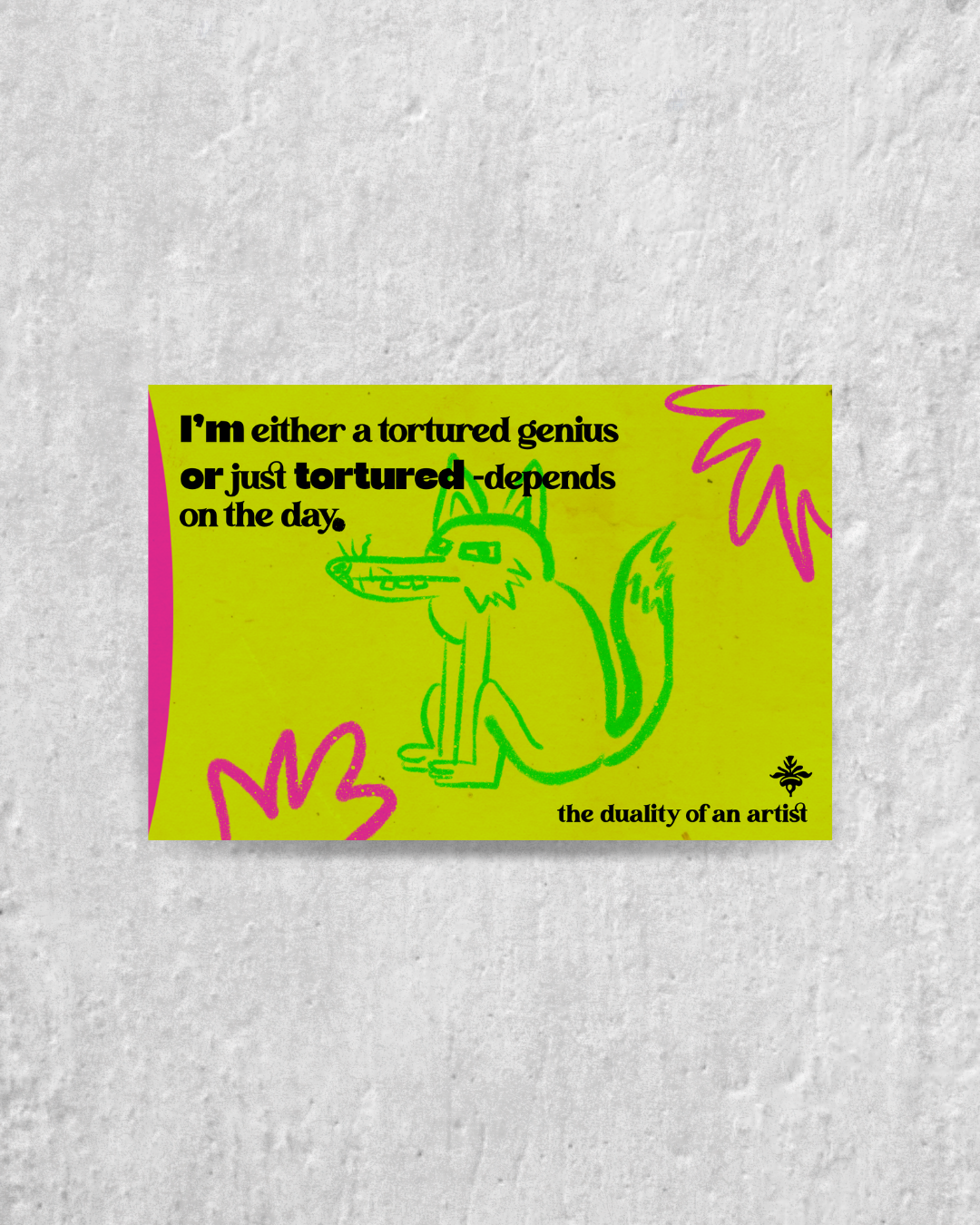 This "Tortured Genius" Postcard is the only proper way to acknowledge the daily internal debate that defines any truly excellent mind. It is a bold admission that sometimes the genius is working, and sometimes, well, things are just a bit tortured. The canine illustration acts as a visual proxy for one's current state of mental affairs. Send it forward and inform others that your inconsistent output is simply a feature, not a failing.